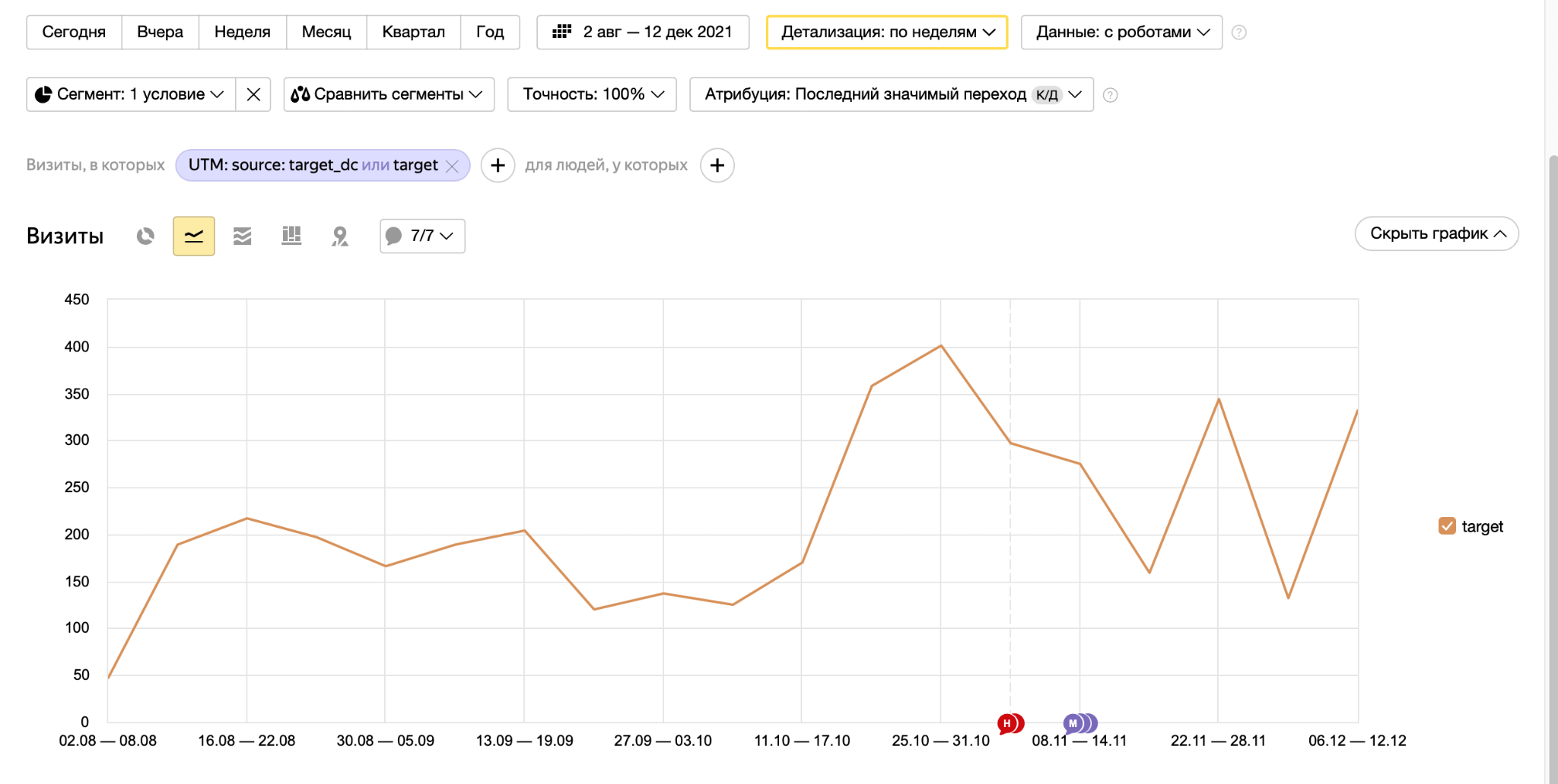 В конце октября 2021 г. был внедрен квиз, сформированы новые офферы. Мы предложили не просто оставить заявку на покупку франшизы, а пройти тест и получить бизнес-план. На графике видно, что за счет внедрения нового оффера и дополнительного бюджета удалось увеличить объем трафика на сайт.