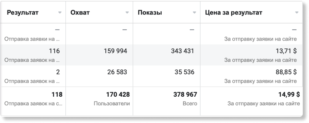 Получили 118 лидов по цене $14,99 (~1125 руб. по курсу на момент работы рекламы)