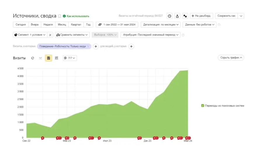 При этом мы не забывали и о постоянных SEO-работах, мониторинге показателей, корректировках под изменяющиеся алгоритмы поисковых систем.