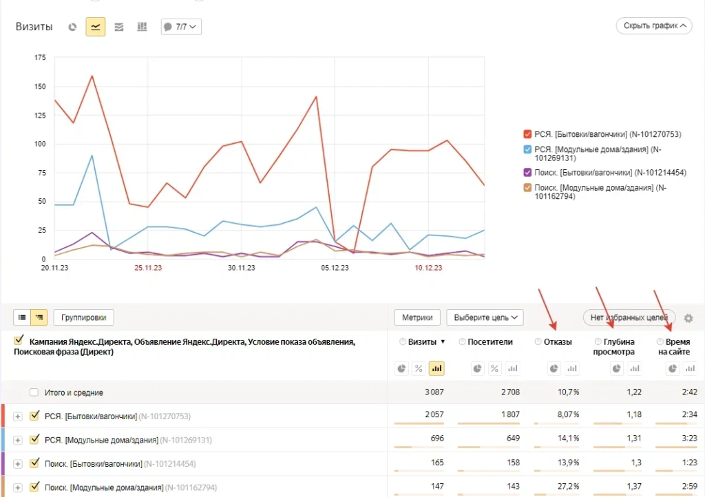 Анализ аудитории по показателю отказа, глубине просмотра и времени на сайте