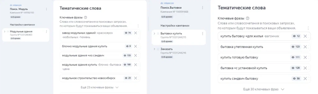 Настройки рекламных кампаний подрядчика на уровне объявлений