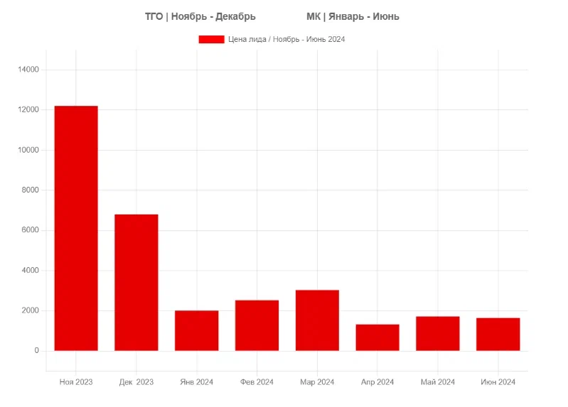 Анализируя данную гистограмму, можно отметить, что в начальный период после старта проекта стоимость лида достигала отметки в 12 000 рублей. Однако, благодаря остановке ТГО кампаний и запуску МК в январе, за последующие шесть месяцев активной оптимизации рекламных кампаний, включая тестирование различных креативов и текстов объявлений, нам удалось достичь желаемой цены лида.