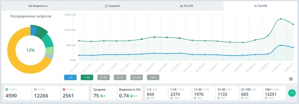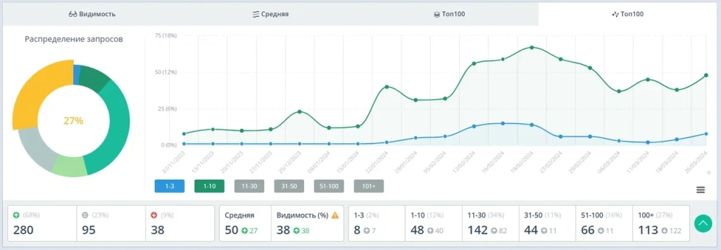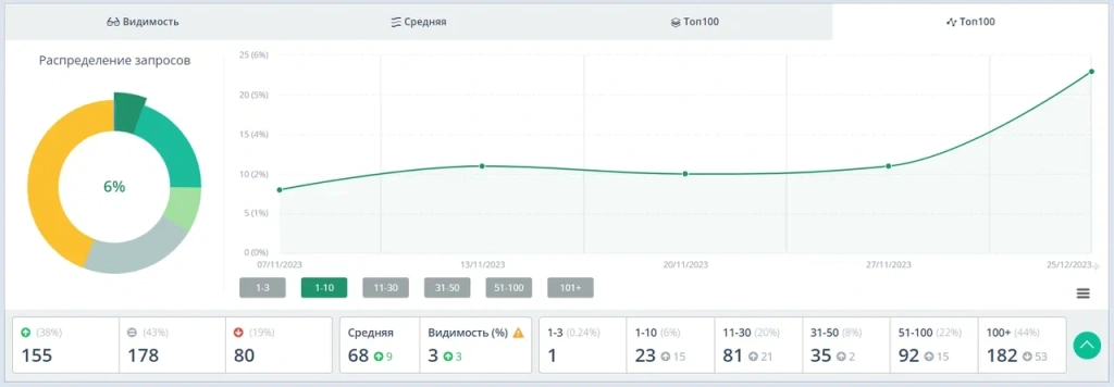 По итогам 3 месяца продвижения количество запросов в ТОП-10 Яндекса увеличилось с 3% до 6%, видимость сайта в поиске с 0% до 3%, выросли позиции у 38% запросов из верхнеуровневого семантического ядра.