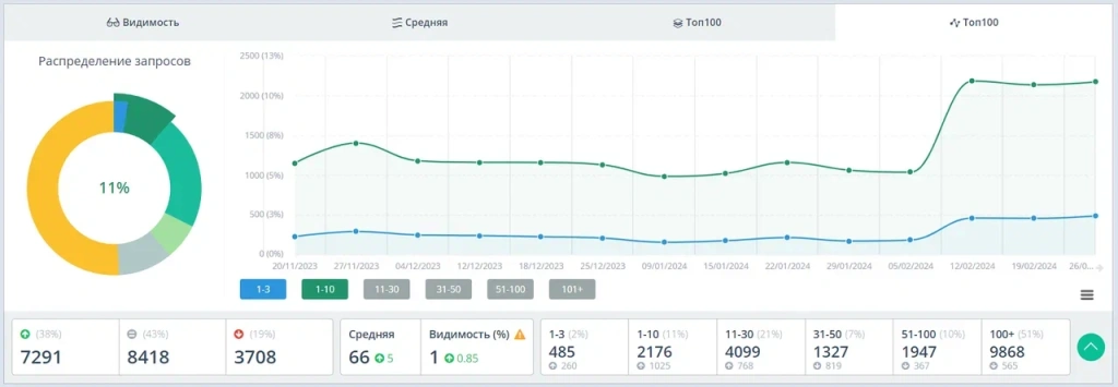 Расширенное СЯ: количество запросов в ТОП-10 Яндекса увеличилось с 6% до 11% +1025 запросов, выросли позиции у 38% запросов.