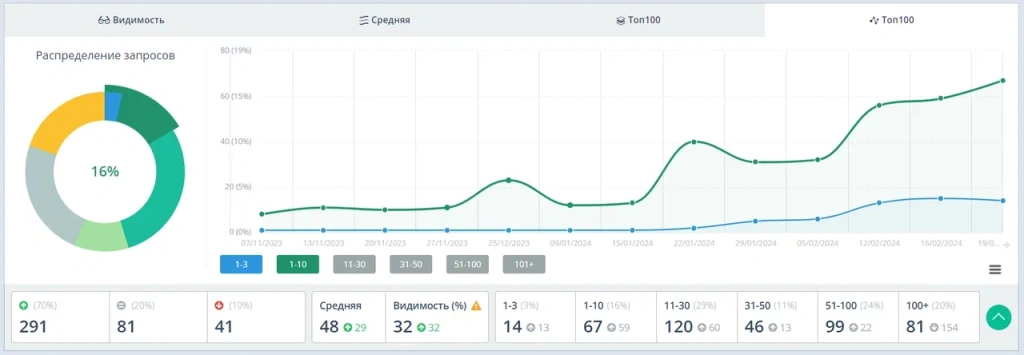 Верхнеуровневое СЯ: количество запросов в ТОП-10 Яндекса увеличилось с 3% до 16%, видимость сайта в поиске с 0 до 32%, выросли позиции у 70% запросов.