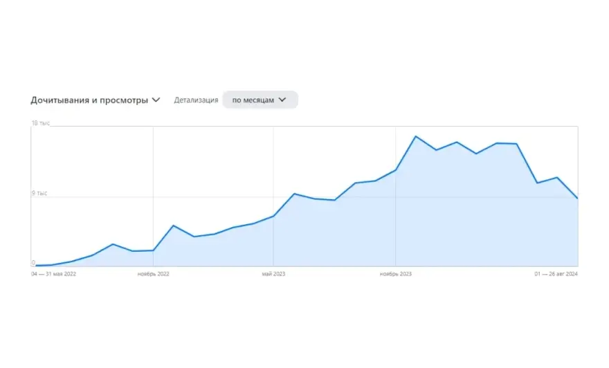 За два с небольшим года работы над блогом в Дзене нам удалось хорошо развить канал. Наши статьи прочитали 216 133 раза, потратив на это 3852 часов. Публикации получили 8 329 лайков, 1 286 раз их репостили и оставили 953 комментария. На 1 августа 2024 года на канале почти 2 тысячи активных подписчиков — и все это без рекламы и дополнительных денежных вложений.