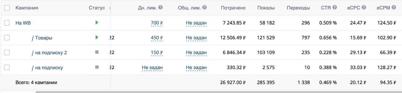 Запустили таргет VK с целью “Переходы по рекламе” со ссылками на карточки товаров Wildberries.