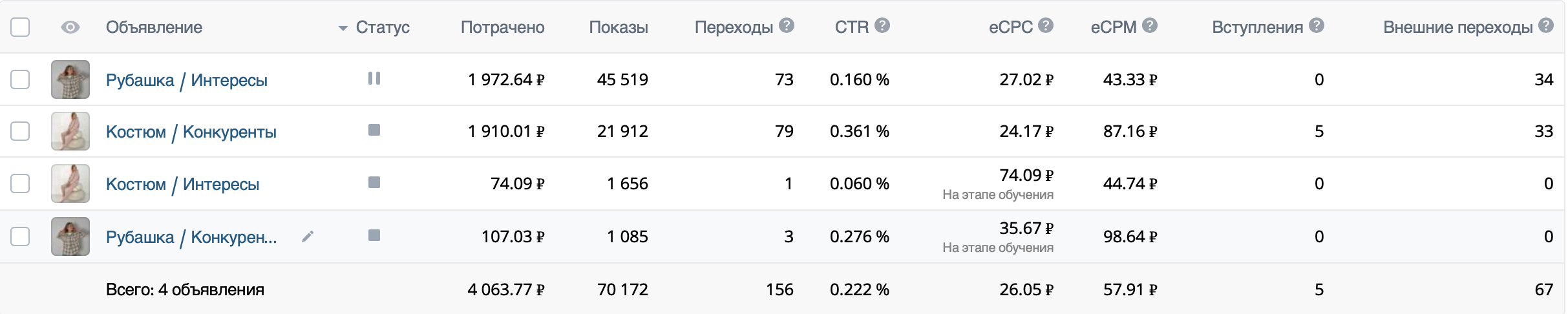 На первом этапе протестировали широкую аудиторию, аудиторию по интересам “Женская одежда” + “Онлайн-покупки”.