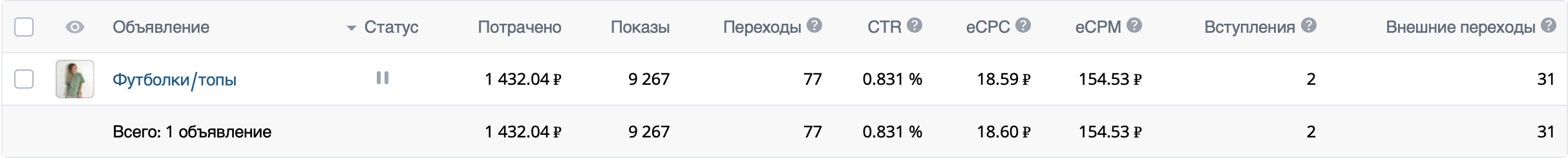 На категорию футболки/топы получили 31 переход на карточку товара Wildberries по 18,6 руб. при затратах 1432,04 руб.
