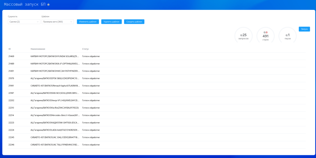 Если данные верны, нажмите кнопку "Запуск" и начнётся обработка данных. По мере выполнения строки в таблице будут менять статус. При возникновении ошибок — вы увидите сообщение об ошибке.