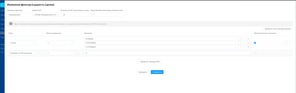 - стадия должна иметь одно из трёх значений: STORAGE, C3:STORAGE, C1:STORAGE;